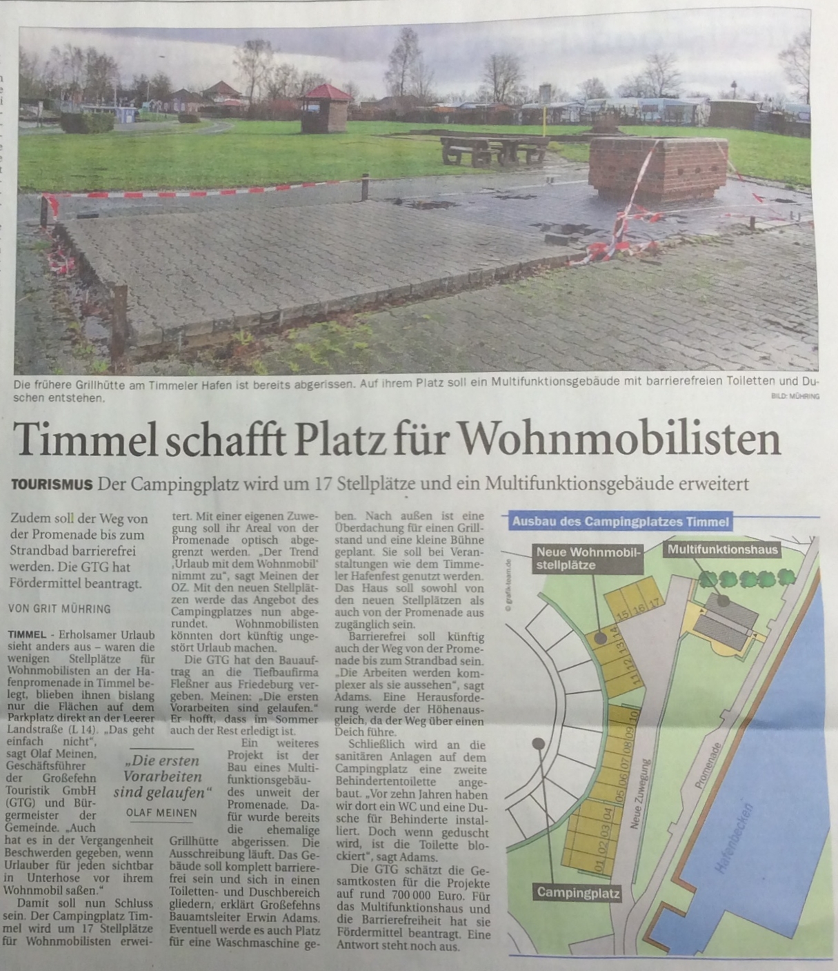 HomepageZeitungsberichte timmel 8 Jahren ago Neue Wohnmobilstellplätze im Hafen Pressebericht: Wohnmobilstellplätze im Hafen Quelle: Ostfriesen-Zeitung vom 17.01.2018 10. SuS Timmel Wintercup » « Ein neues Design für timmel.net Categories: Unterkunft Zeitungsberichte timmel: Related Post Großefehn Tourismus GmbH plant Flüchtlingsunterkünfte am Timmeler Meer im Luftkurort Timmel Nachdem man über 15 Jahre lang viele Millionen Euro in dem Prestigeprojekt „Reitsport-Touristik-Centrum“ versenkt hat,… Open-Air am Timmeler Meer am 31. Juli 2021 Quelle: Ostfriesen-Zeitung vom 23.07.2021 Gastgeberverzeichnis 2021 Die Großefehn Tourismus GmbH hat das Gastgeberverzeichnis für das Jahr 2021 publiziert. Schauen Sie einfach…